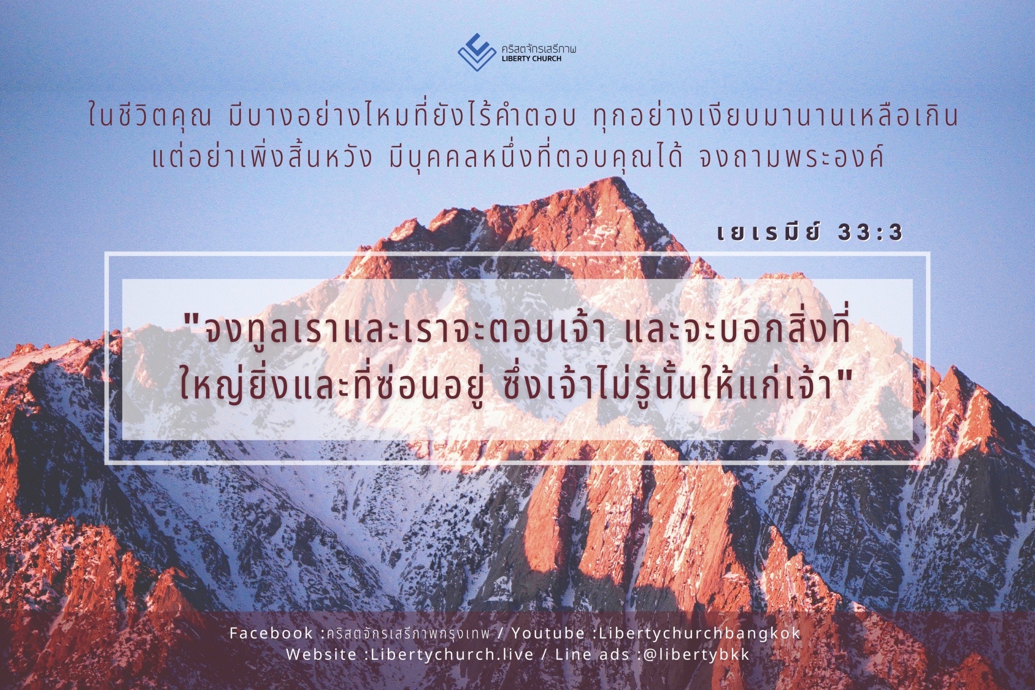 "จงทูลเรา และเราจะตอบเจ้า และจะบอกสิ่งที่ใหญ่ยิ่งและที่ซ่อนอยู่ ซึ่งเจ้าไม่รู้นั้นให้แก่เจ้า" (เยเรมีย์ 33:3 TH1971)